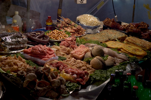 屋台の食材。冬場の屋台はビニールに囲まれ立派なポジャンマチャ(포장마차)になります。