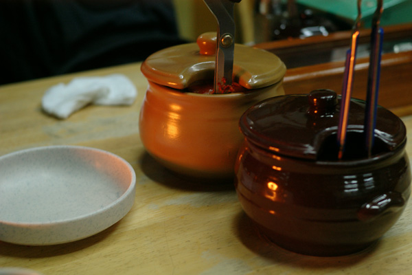 こういう店に来た場合(ヘジャングクとかソルロンタン屋とか)、キムチは瓶で渡されるので自分で食べる分だけ切らなければなりません。