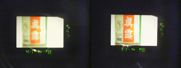 新しいスクリーンの様子。左がピントずれの状態で、右が合ったと時。右上が斜めになっているのはパキッとやってしまった証拠です。
