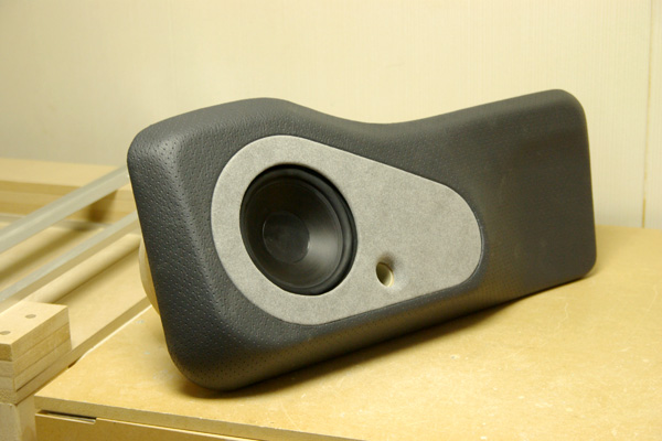 本体と化粧板にレザーを貼ってフロントスピーカーのエンクロージャーは完成。