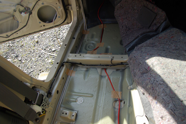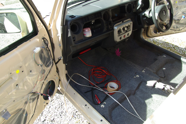 配線ルートは電源ケーブルと信号線はなるべく離して這わせます。中央の赤いケーブルがエンジンルームから通した電源ケーブル、左側のがドアとAピラーに行くスピーカーケーブルです。