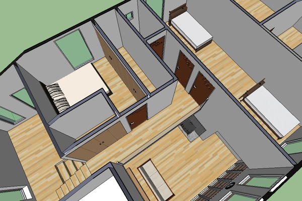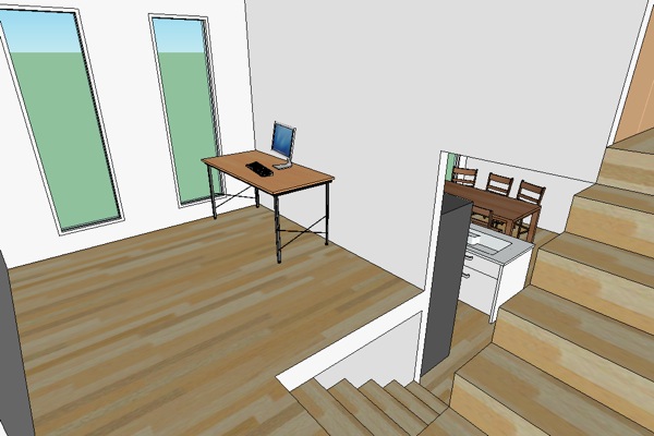 奥側は中2階と半地下があるスキップフロア。
