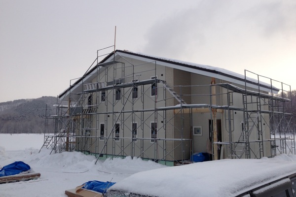 おもて面の外壁が張り終わりました。 窓も玄関も付いたしだいたい完成のイメージが見えてきたと思います。