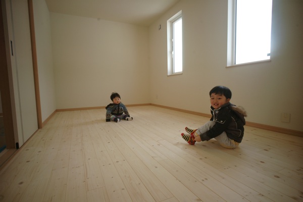 子供が写ってる写真は子供部屋。家の8割ほどはこのフローリングで、下川の森林組合で作っているトドマツの無垢板です。